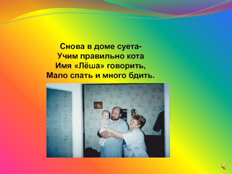 Слайд 10 Снова в доме суета- Учим правильно кота Имя «Лёша» говорить, Мало спать и много