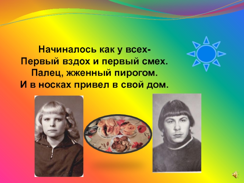 Слайд 3Начиналось как у всех- Первый вздох и первый смех. Палец, жженный пирогом. И в