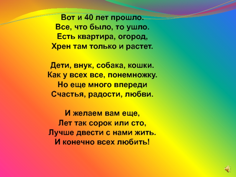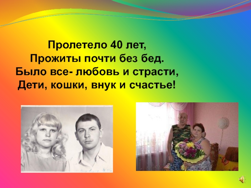 Слайд 2Пролетело 40 лет, Прожиты почти без бед. Было все- любовь и страсти, Дети, кошки,
