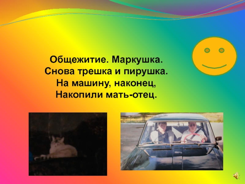 Слайд 9 Общежитие. Маркушка. Снова трешка и пирушка. На машину, наконец, Накопили мать-отец.
