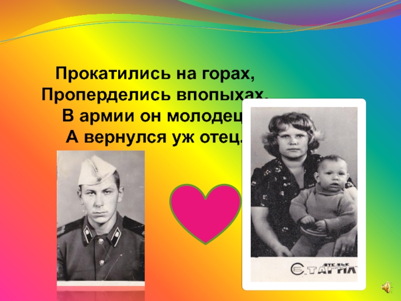 Слайд 4Прокатились на горах, Проперделись впопыхах. В армии он молодец, А вернулся уж отец.