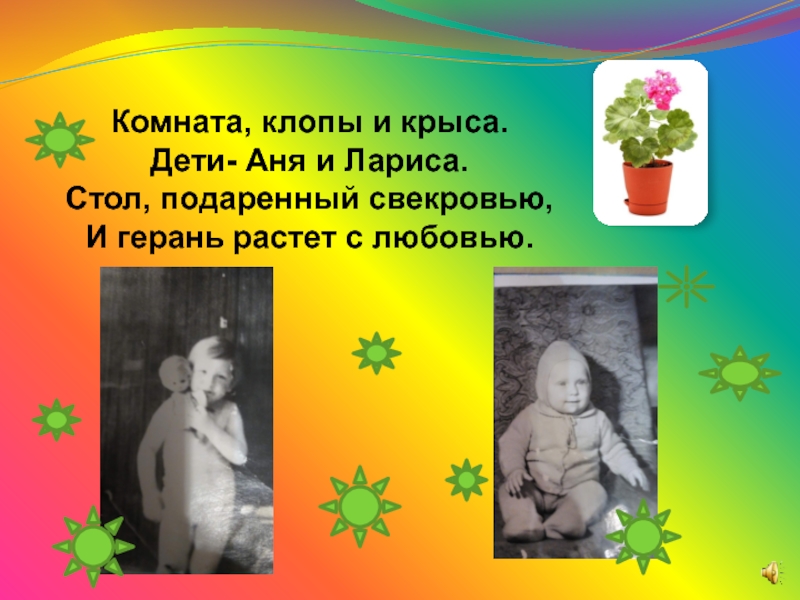 Слайд 5Комната, клопы и крыса. Дети- Аня и Лариса. Стол, подаренный свекровью, И герань растет