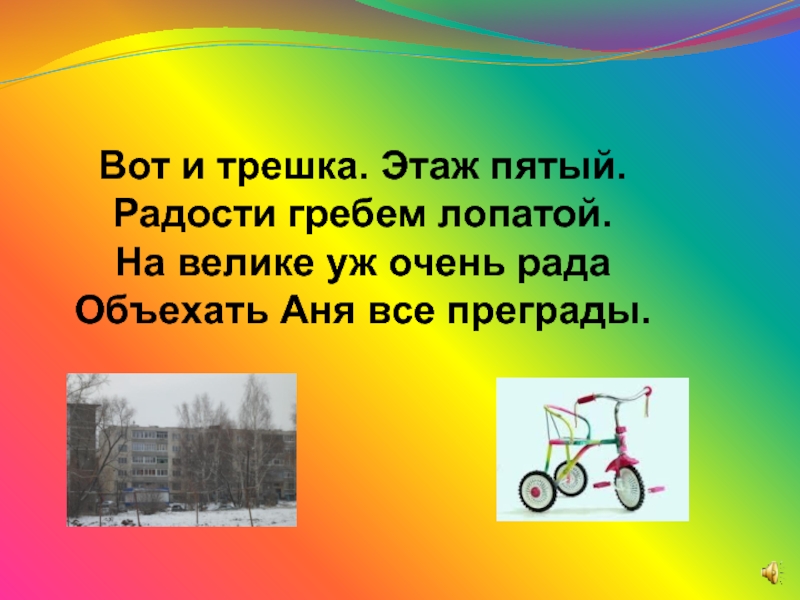 Слайд 7Вот и трешка. Этаж пятый. Радости гребем лопатой. На велике уж очень рада Объехать