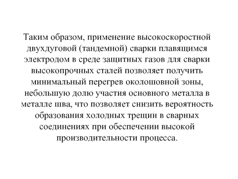 Слайд 74Таким образом, применение высокоскоростной двухдуговой (тандемной) сварки плавящимся электродом в среде