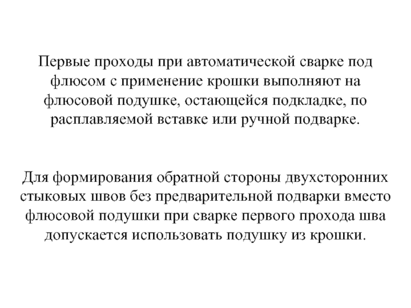 Слайд 37Первые проходы при автоматической сварке под флюсом с применение крошки выполняют
