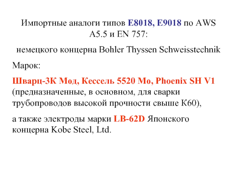 Слайд 4Импортные аналоги типов E8018, E9018 по AWS A5.5 и EN 757