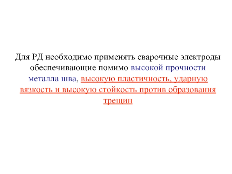 Слайд 2Для РД необходимо применять сварочные электроды обеспечивающие помимо высокой прочности металла