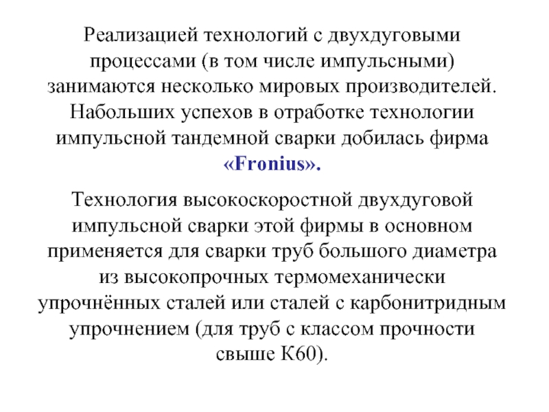 Слайд 61Реализацией технологий с двухдуговыми процессами (в том числе импульсными) занимаются несколько