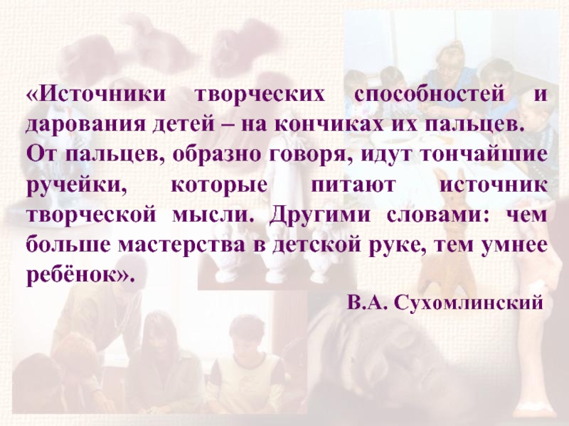 Слайд 2«Источники творческих способностей и дарования детей – на кончиках их пальцев.