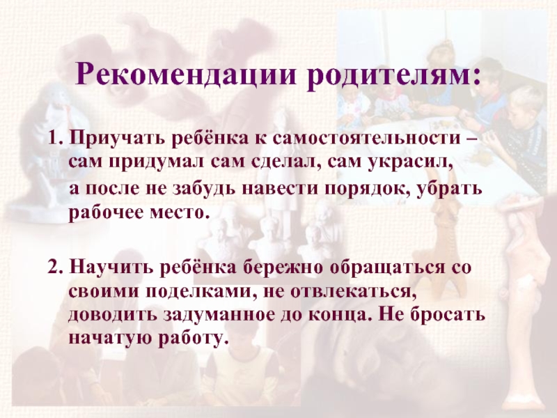 2. Научить ребёнка бережно обращаться со своими поделками, не отвлекаться, доводить задуманное до конца. Не бросать начатую работу.