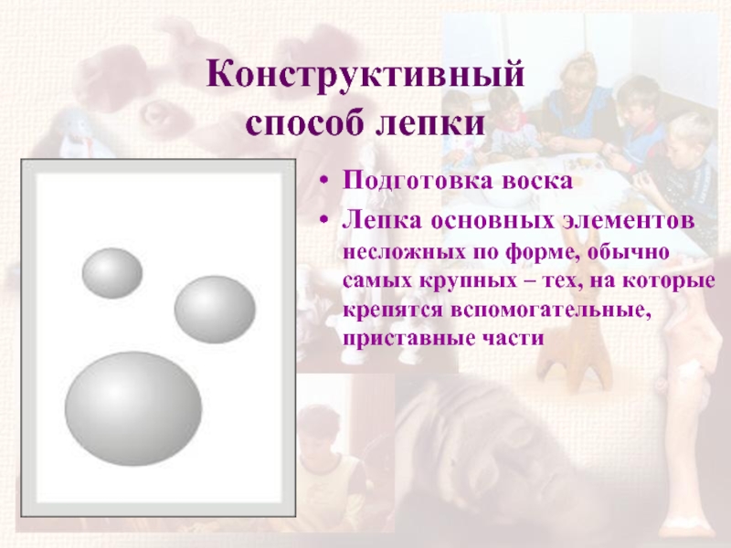 Обучающая: Учить детей основным формообразующим движениям, способам и приёмам лепки из