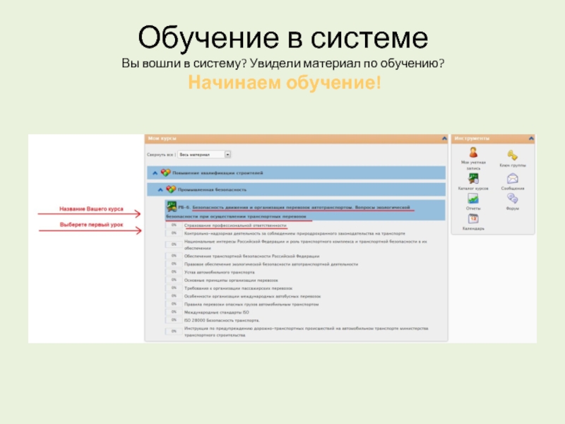 Слайд 3Обучение в системе Вы вошли в систему? Увидели материал по обучению? Начинаем