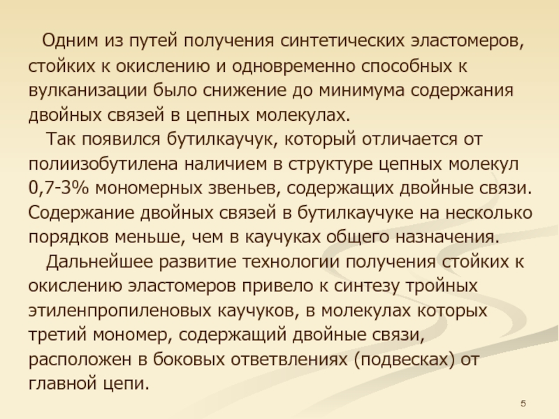 Слайд 5 Одним из путей получения синтетических эластомеров, стойких к окислению и