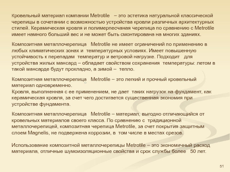 в сочетании с возможностью устройства кровли различных архитектурных стилей. Керамическая кровля и полимерпесчаная черепица по сравнению с Metrotile имеет намного больший вес и не может быть смонтирована на многих зданиях.