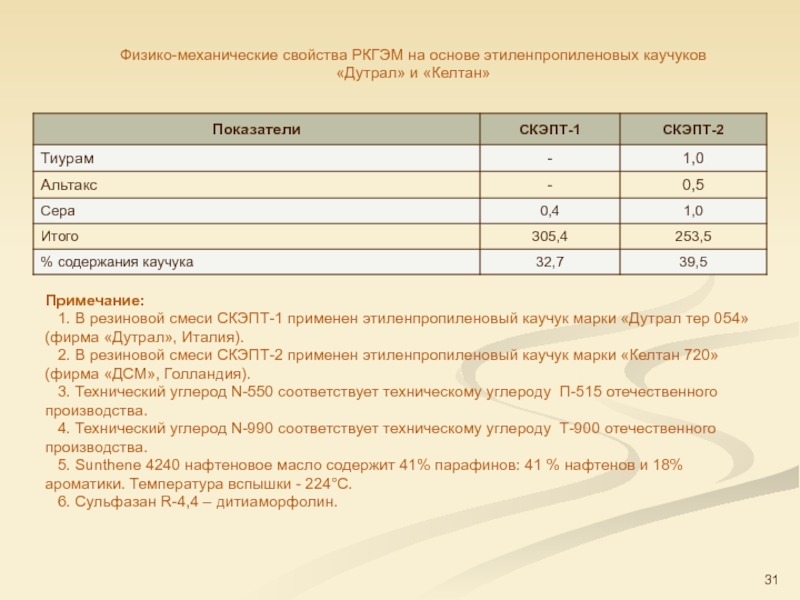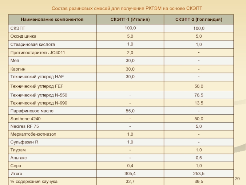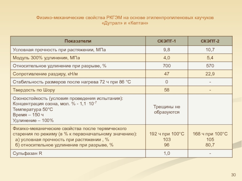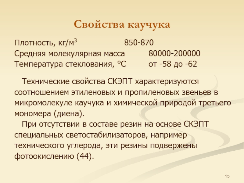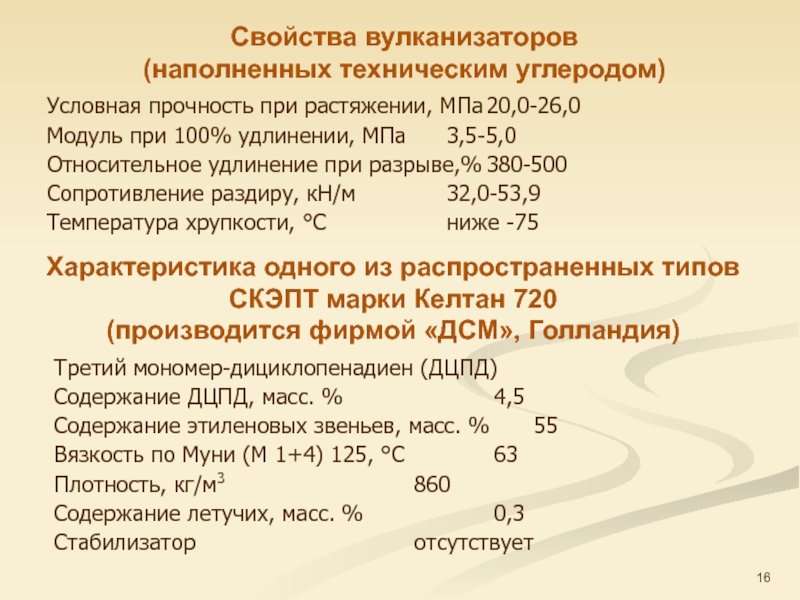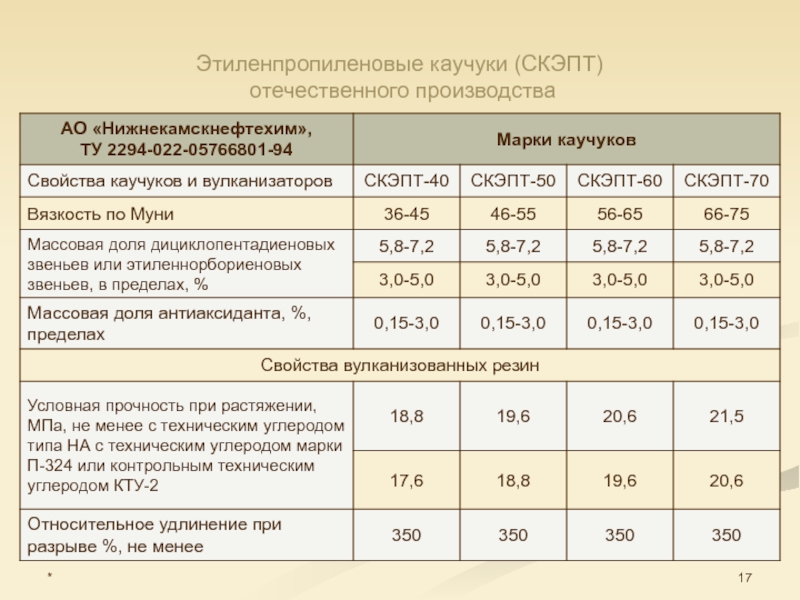 Технические свойства СКЭПТ характеризуются соотношением этиленовых и пропиленовых звеньев в микромолекуле каучука и химической природой третьего мономера (диена).