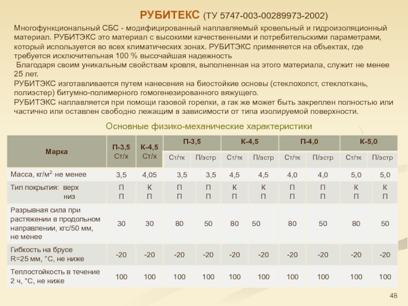 РУБИТЭКС изготавливается путем нанесения на биостойкие основы (стеклохолст, стеклоткань, полиэстер) битумно-полимерного гомогенезированного вяжущего.