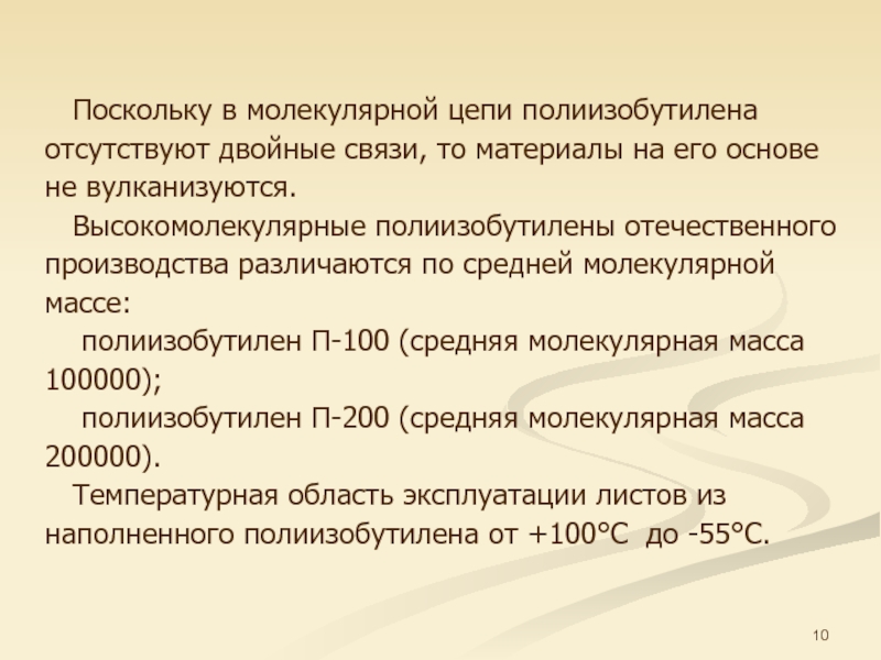 Слайд 10 Поскольку в молекулярной цепи полиизобутилена отсутствуют двойные связи, то