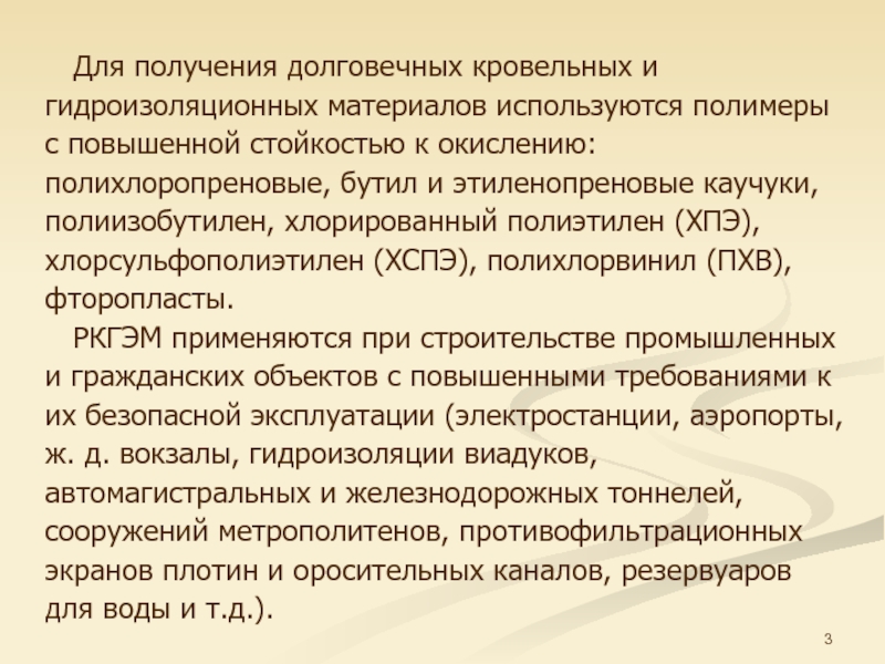Слайд 3 Для получения долговечных кровельных и гидроизоляционных материалов используются полимеры