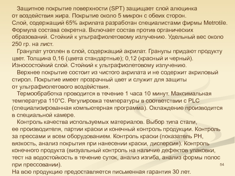 кровель с уклоном от 12 до 90 градусов. Это высокотехнологичный продукт, производимый в Бельгии, с уникальными характеристиками и развивающимся модельным рядом. Благодаря многообразию типов и цветовых решений кровля Metrotile формирует и дополняет архитектурные решения, разрабатываемые в различных стилистических предпочтениях, начиная с неоготики и заканчивая Hi-Tech. Metrotile имеет в основе стальной лист, с двух сторон покрытый алюмоцинковым сплавом, который увеличивает сопротивление коррозии.