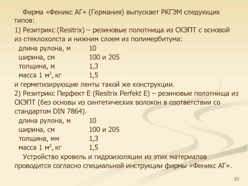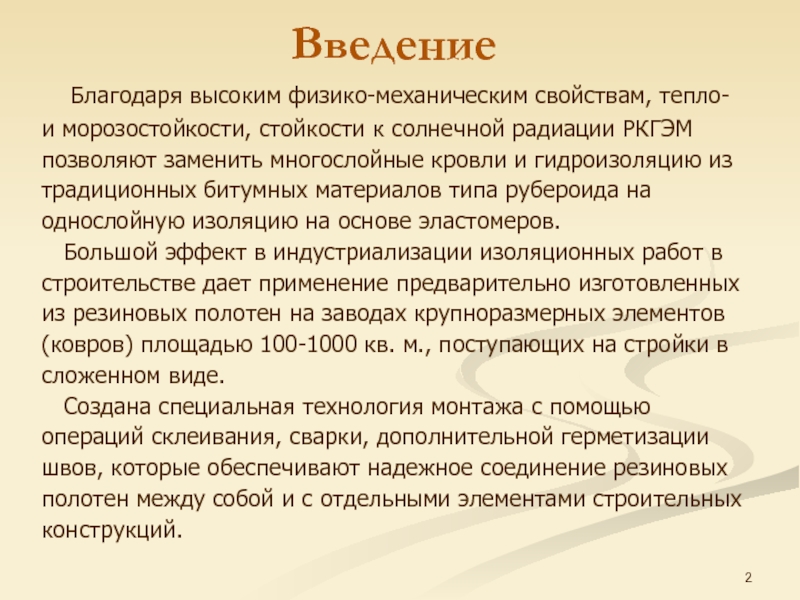 к солнечной радиации РКГЭМ позволяют заменить многослойные кровли и гидроизоляцию из традиционных битумных материалов типа рубероида на однослойную изоляцию на основе эластомеров.