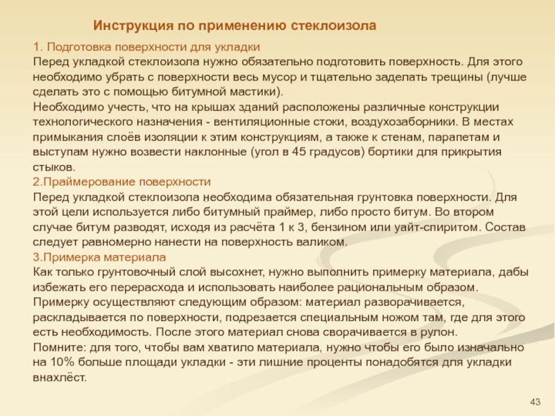 Перед укладкой стеклоизола необходима обязательная грунтовка поверхности. Для этой цели используется либо битумный праймер, либо просто битум. Во втором случае битум разводят, исходя из расчёта 1 к 3, бензином или уайт-спиритом. Состав следует равномерно нанести на поверхность валиком.