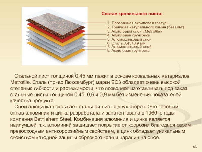 материалов Metrotile. Сталь (пр‐во Люксембург) марки ЕС3 обладает очень высокой степенью гибкости и растяжимости, что позволяет изготавливать под заказ стальные листы толщиной 0,45; 0,6 и 0,9 мм без изменения показателей качества продукта.