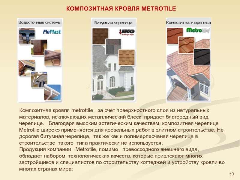 оптимальным выбором для строительства и реконструкции любых зданий со скатной кровлей. Дома, покрытые композитной черепицей Metrotile, вы увидите по всему миру.