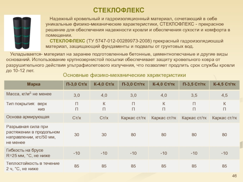 себе уникальные физико-механические характеристики, СТЕКЛОФЛЕКС - прекрасное решение для обеспечения надежности кровли и обеспечения сухости и комфорта в помещении.