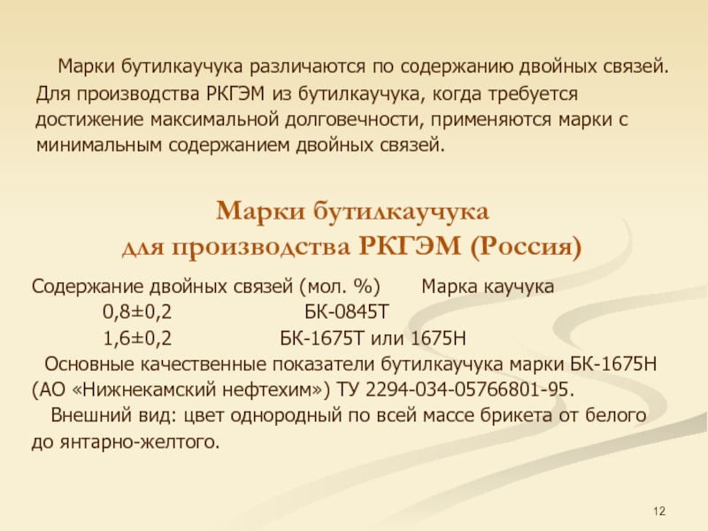Слайд 12 Марки бутилкаучука различаются по содержанию двойных связей. Для производства