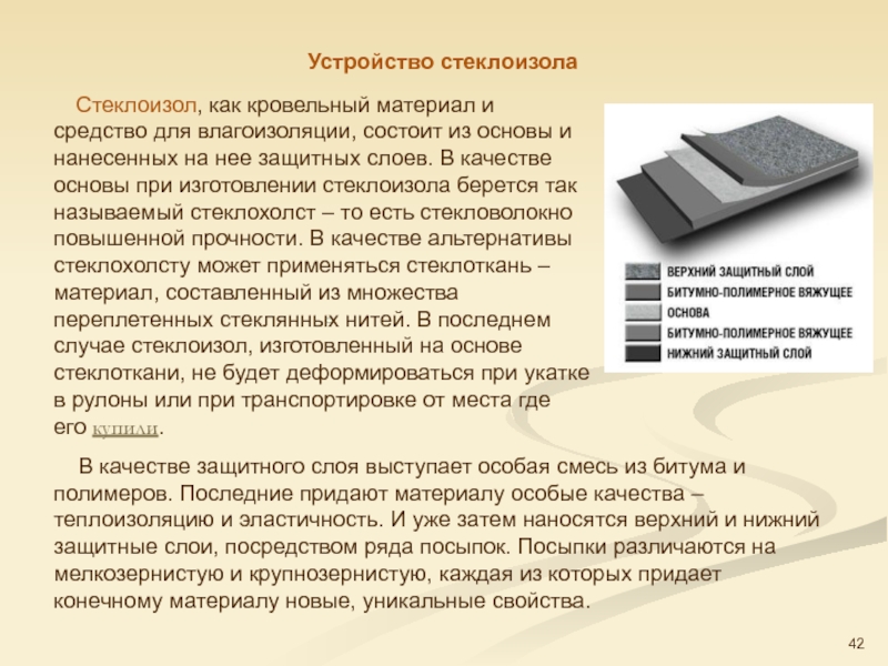 В качестве основы используются только биостойкая стеклооснова на которую с двух сторон нанесено битумное вяжущее. Нижняя сторона защищена легкоплавкой полиэтиленовой пленкой, которая гарантированно сгорает при наплавлении, герметичность кровельного ковра.