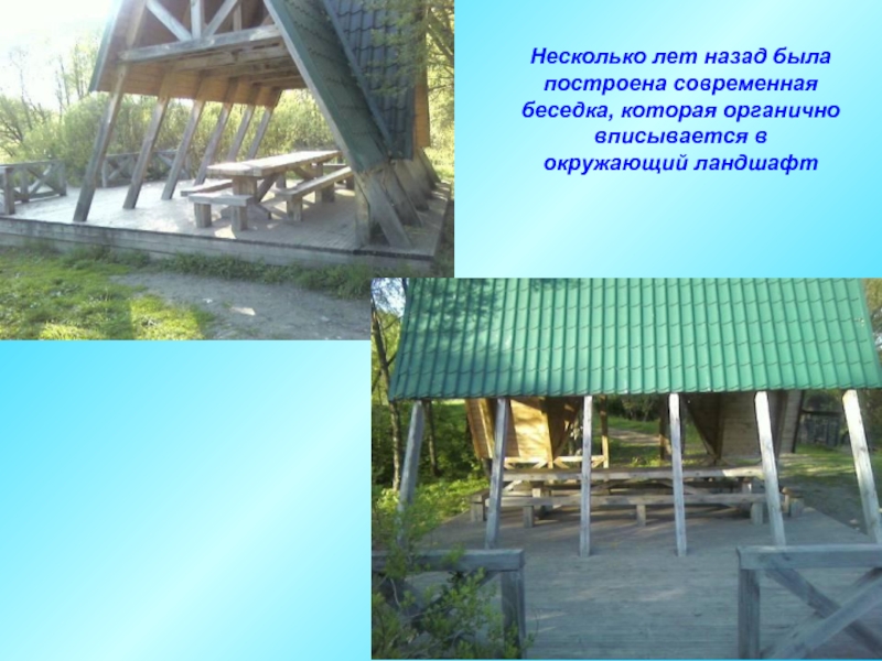 Слайд 15Несколько лет назад была построена современная беседка, которая органично вписывается в