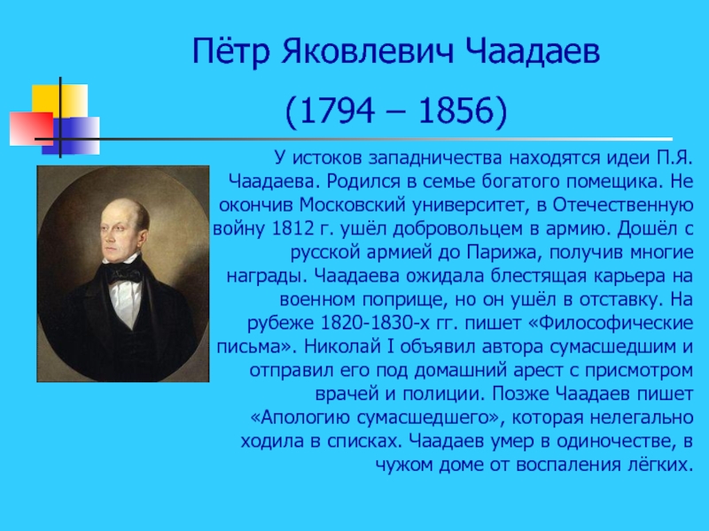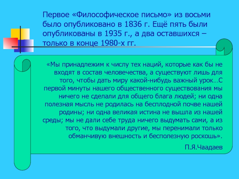 «Мы принадлежим к числу тех наций, которые как бы не входят в состав человечества, а существуют лишь для того, чтобы дать миру какой-нибудь важный урок…С первой минуты нашего общественного существования мы ничего не сделали для общего блага людей; ни одна полезная мысль не родилась на бесплодной почве нашей родины; ни одна великая истина не вышла из нашей среды; мы не дали себе труда ничего выдумать сами, а из того, что выдумали другие, мы перенимали только обманчивую внешность и бесполезную роскошь».