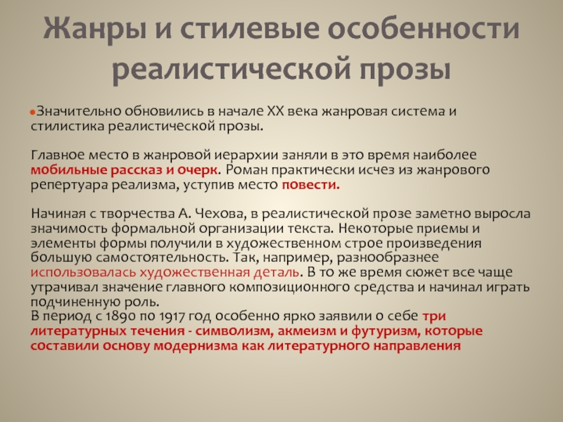 Начиная с творчества А. Чехова, в реалистической прозе заметно выросла значимость формальной организации текста. Некоторые приемы и элементы формы получили в художественном строе произведения большую самостоятельность. Так, например, разнообразнее использовалась художественная деталь. В то же время сюжет все чаще утрачивал значение главного композиционного средства и начинал играть подчиненную роль.
