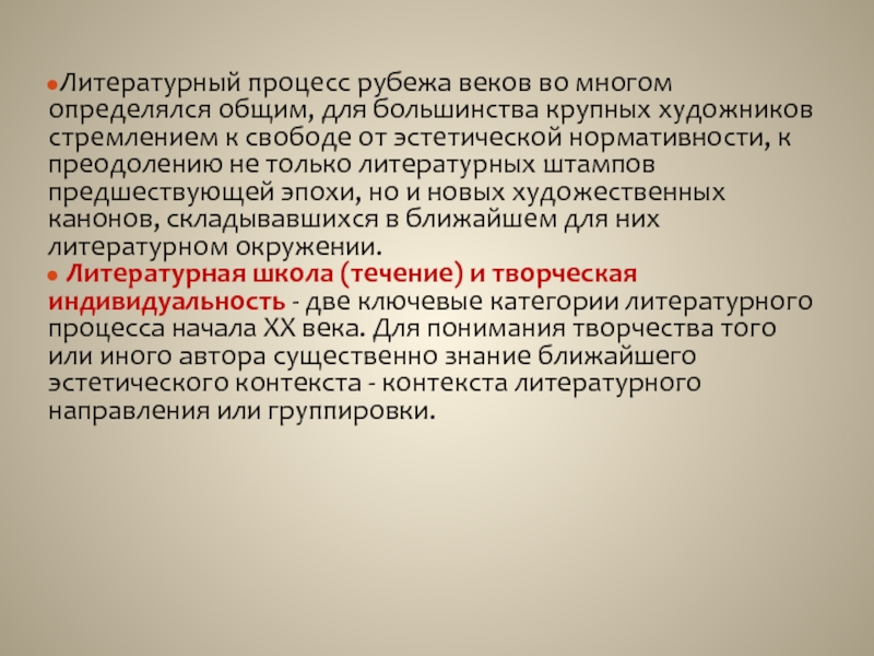 Литературный процесс рубежа веков во многом определялся общим, для большинства крупных художников стремлением к свободе от эстетической нормативности, к преодолению не только литературных штампов предшествующей эпохи, но и новых художественных канонов, складывавшихся в ближайшем для них литературном окружении. Литературная школа (течение) и творческая индивидуальность - две ключевые категории литературного процесса начала XX века. Для понимания творчества того или иного автора существенно знание ближайшего эстетического контекста - контекста литературного направления или группировки.