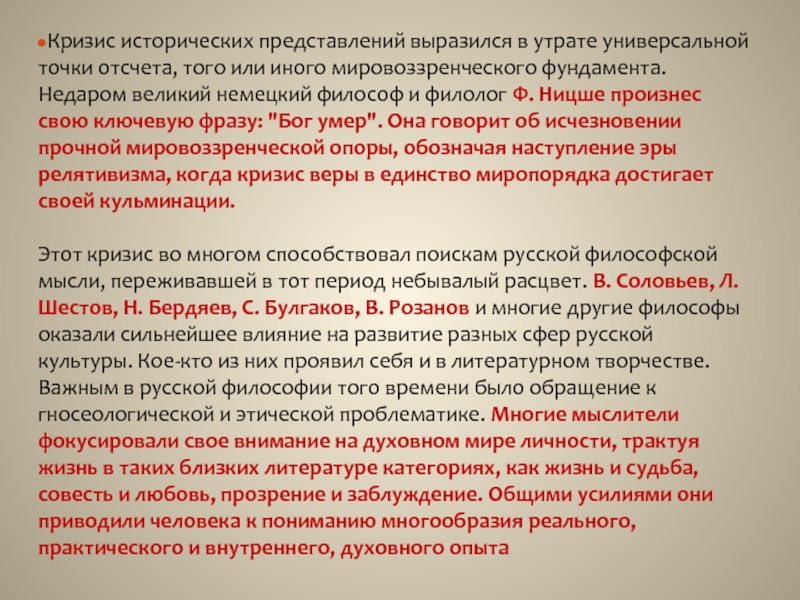 Этот кризис во многом способствовал поискам русской философской мысли, переживавшей в тот период небывалый расцвет. В. Соловьев, Л. Шестов, Н. Бердяев, С. Булгаков, В. Розанов и многие другие философы оказали сильнейшее влияние на развитие разных сфер русской культуры. Кое-кто из них проявил себя и в литературном творчестве. Важным в русской философии того времени было обращение к гносеологической и этической проблематике. Многие мыслители фокусировали свое внимание на духовном мире личности, трактуя жизнь в таких близких литературе категориях, как жизнь и судьба, совесть и любовь, прозрение и заблуждение. Общими усилиями они приводили человека к пониманию многообразия реального, практического и внутреннего, духовного опыта