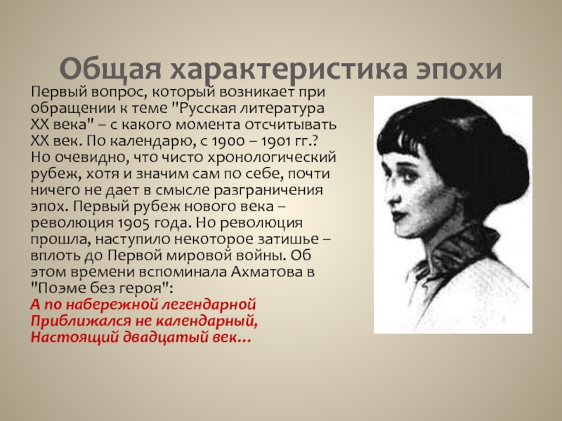 литература XX века" – с какого момента отсчитывать XX век. По календарю, с 1900 – 1901 гг.? Но очевидно, что чисто хронологический рубеж, хотя и значим сам по себе, почти ничего не дает в смысле разграничения эпох. Первый рубеж нового века – революция 1905 года. Но революция прошла, наступило некоторое затишье – вплоть до Первой мировой войны. Об этом времени вспоминала Ахматова в "Поэме без героя":