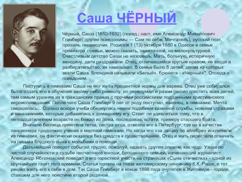 Чёрный, Саша (1880-1932) (псевд.; наст. имя Александр Михайлович Гликберг; другие псевдонимы — Сам по себе, Мечтатель), русский поэт, прозаик, переводчик. Родился 1 (13) октября 1880 в Одессе в семье провизора - семье, можно сказать, зажиточной, но малокультурной. Счастливым детство Саши не назовешь. Мать, больную, истеричную женщину, дети раздражали. Отец, отличавшийся крутым нравом, не входя в разбирательство, их наказывал. В семье было 5 детей, двоих из которых звали Саша. Блондина называли «Белый», брюнета - «Черный»". Отсюда и псевдоним.