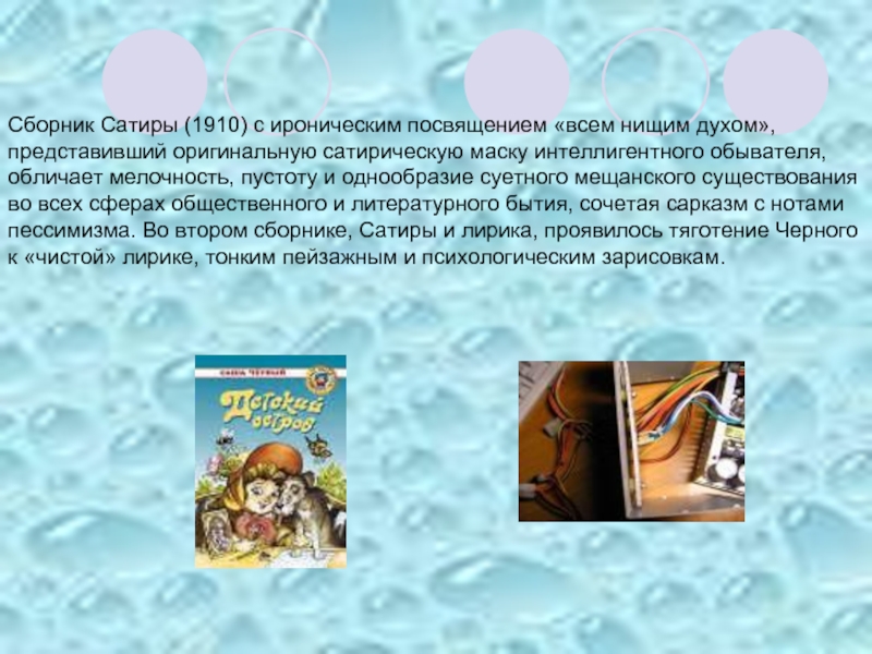 сатирическую маску интеллигентного обывателя, обличает мелочность, пустоту и однообразие суетного мещанского существования во всех сферах общественного и литературного бытия, сочетая сарказм с нотами пессимизма. Во втором сборнике, Сатиры и лирика, проявилось тяготение Черного к «чистой» лирике, тонким пейзажным и психологическим зарисовкам.