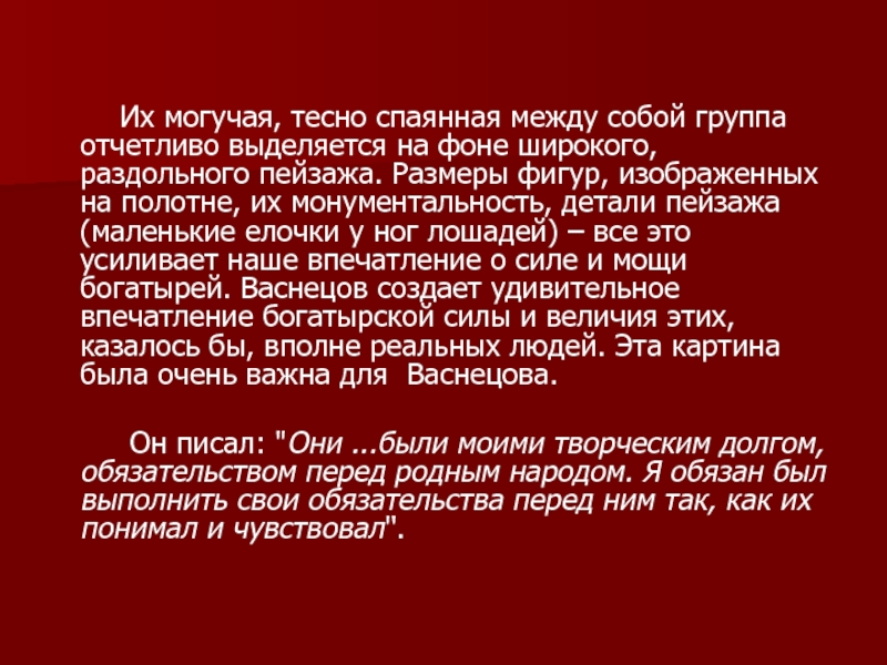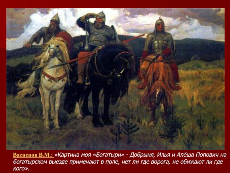 Васнецов В.М.: «Картина моя «Богатыри» - Добрыня, Илья и Алёша Попович на богатырском выезде примечают в поле, нет ли где ворога, не обижают ли где кого».