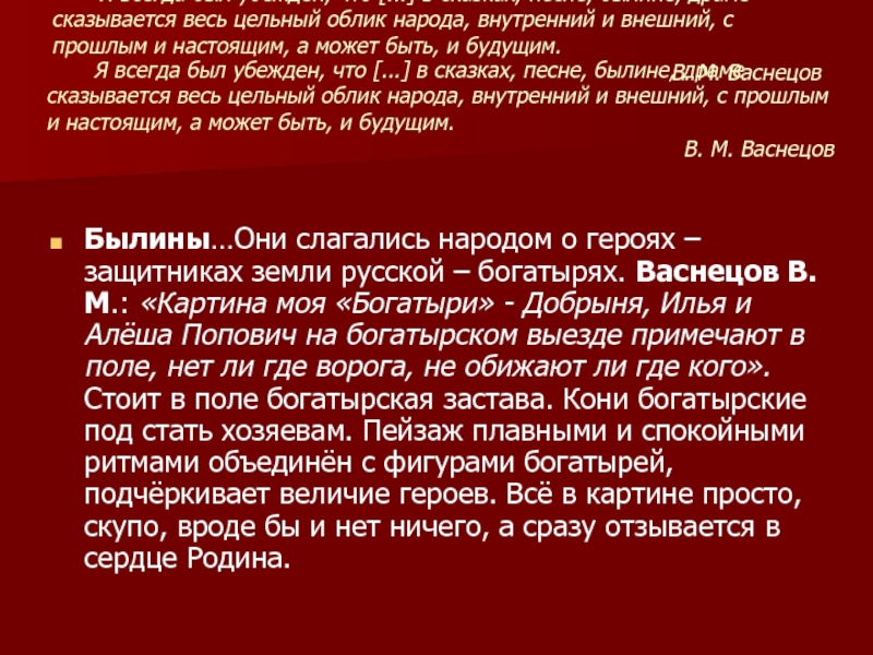 Былины…Они слагались народом о героях – защитниках земли русской – богатырях. Васнецов В.М.: «Картина моя «Богатыри» - Добрыня, Илья и Алёша Попович на богатырском выезде примечают в поле, нет ли где ворога, не обижают ли где кого». Стоит в поле богатырская застава. Кони богатырские под стать хозяевам. Пейзаж плавными и спокойными ритмами объединён с фигурами богатырей, подчёркивает величие героев. Всё в картине просто, скупо, вроде бы и нет ничего, а сразу отзывается в сердце Родина.
