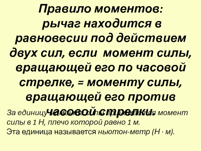 За единицу момента силы принимается момент силы в 1 Н, плечо которой равно 1 м.