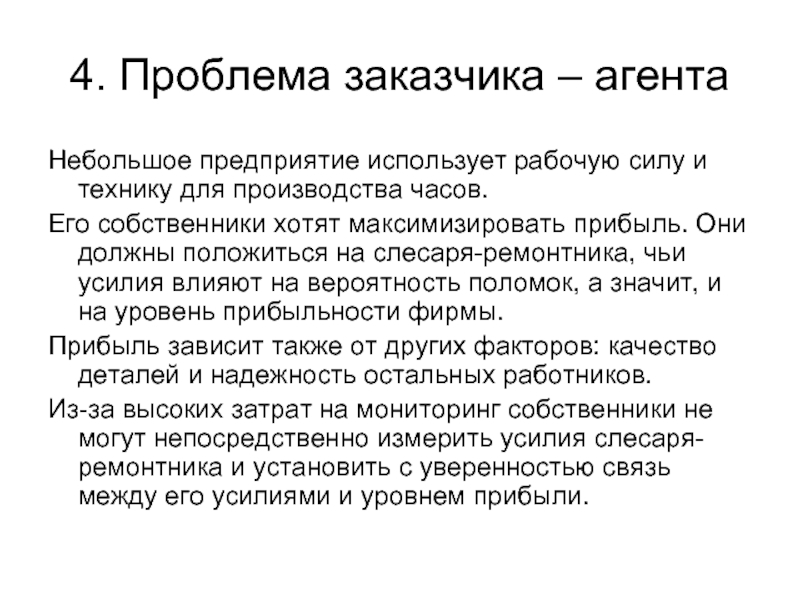 Его собственники хотят максимизировать прибыль. Они должны положиться на слесаря-ремонтника, чьи усилия влияют на вероятность поломок, а значит, и на уровень прибыльности фирмы.