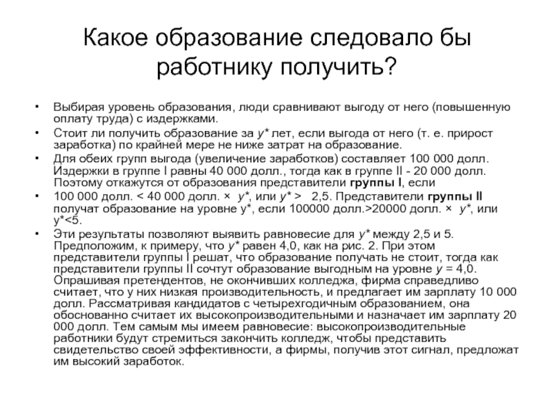 Всякое образование предполагает затраты, которые тем выше, чем больше уровень у. Эти затраты включают плату за обучение, стоимость книг, неполученную заработную плату и оценку соответствующей психической нагрузки. Важно, что затраты на образование выше у низкоэффективной группы, чем у высокоэффективной. Тому есть две причины.