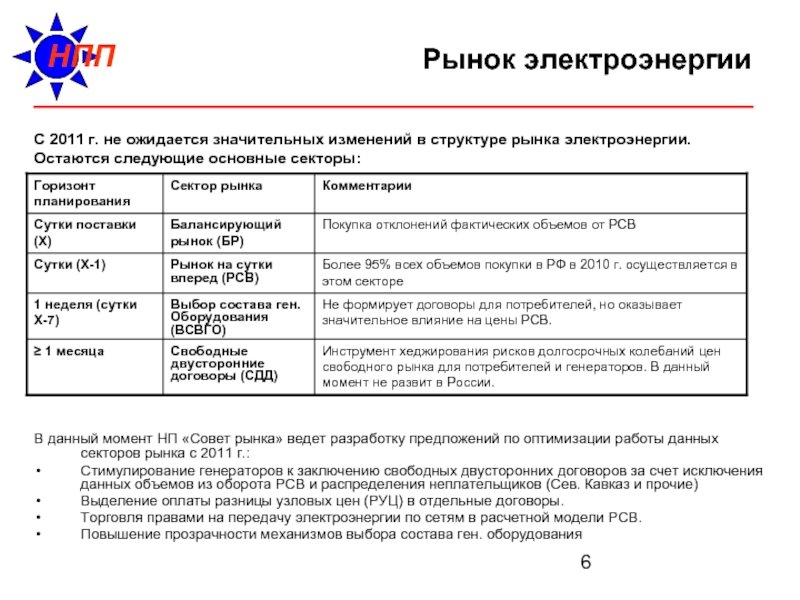 В данный момент НП «Совет рынка» ведет разработку предложений по оптимизации работы данных секторов рынка с 2011 г.: