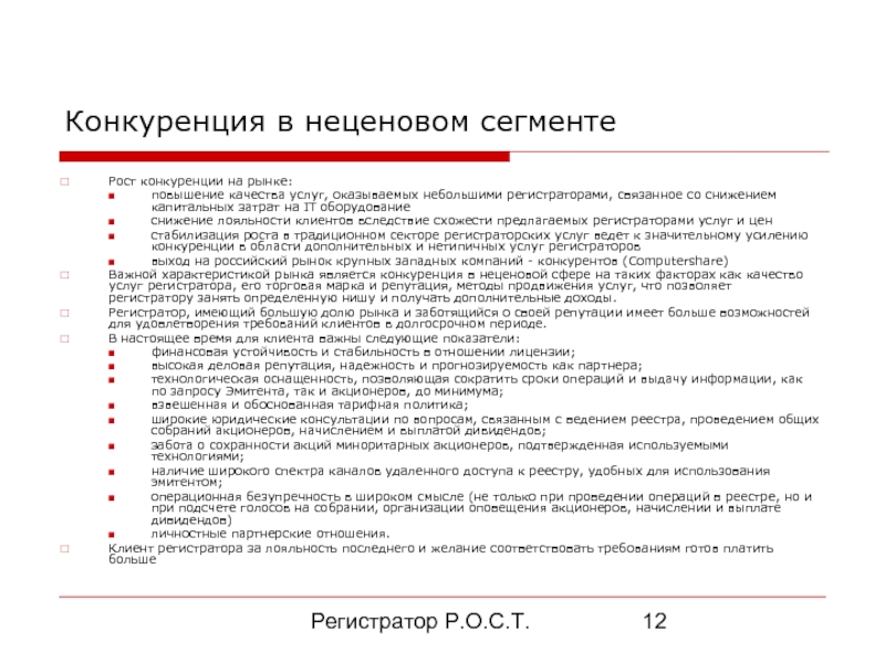 Важной характеристикой рынка является конкуренция в неценовой сфере на таких факторах как качество услуг регистратора, его торговая марка и репутация, методы продвижения услуг, что позволяет регистратору занять определенную нишу и получать дополнительные доходы.