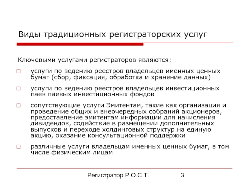 Виды традиционных регистраторских услуг