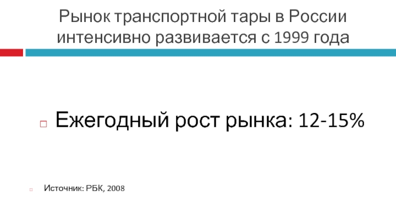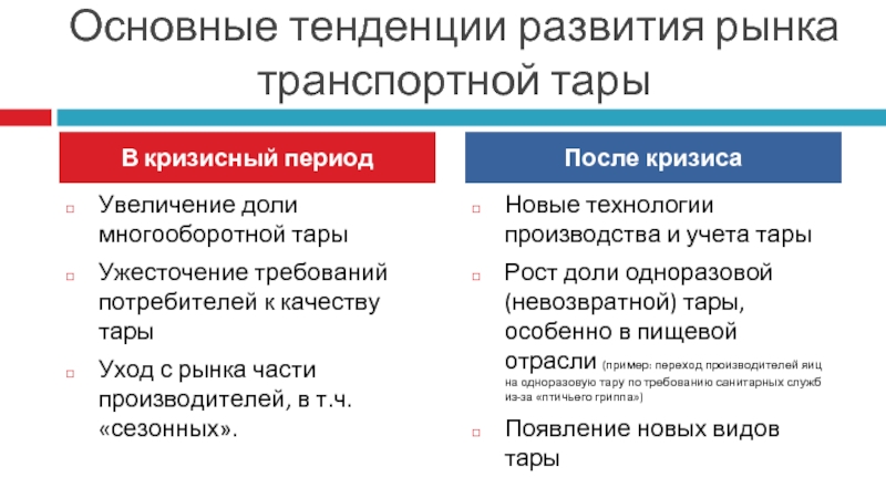 Рост доли одноразовой (невозвратной) тары, особенно в пищевой отрасли (пример: переход производителей яиц на одноразовую тару по требованию санитарных служб из-за «птичьего гриппа»)