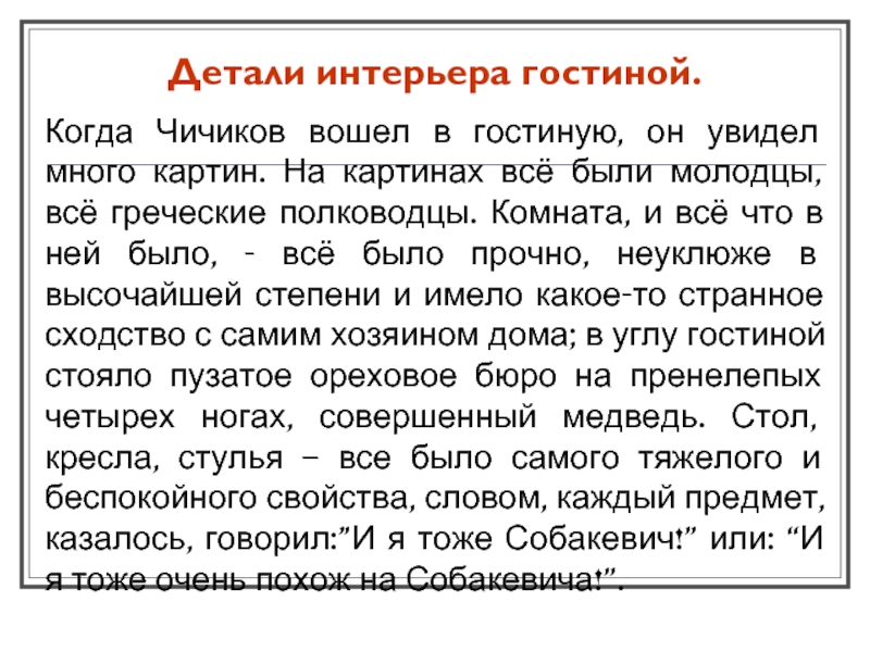 На картинах всё были молодцы, всё греческие полководцы. Комната, и всё что в ней было, - всё было прочно, неуклюже в высочайшей степени и имело какое-то странное сходство с самим хозяином дома; в углу гостиной стояло пузатое ореховое бюро на пренелепых четырех ногах, совершенный медведь. Стол, кресла, стулья – все было самого тяжелого и беспокойного свойства, словом, каждый предмет, казалось, говорил:”И я тоже Собакевич!” или: “И я тоже очень похож на Собакевича!”.