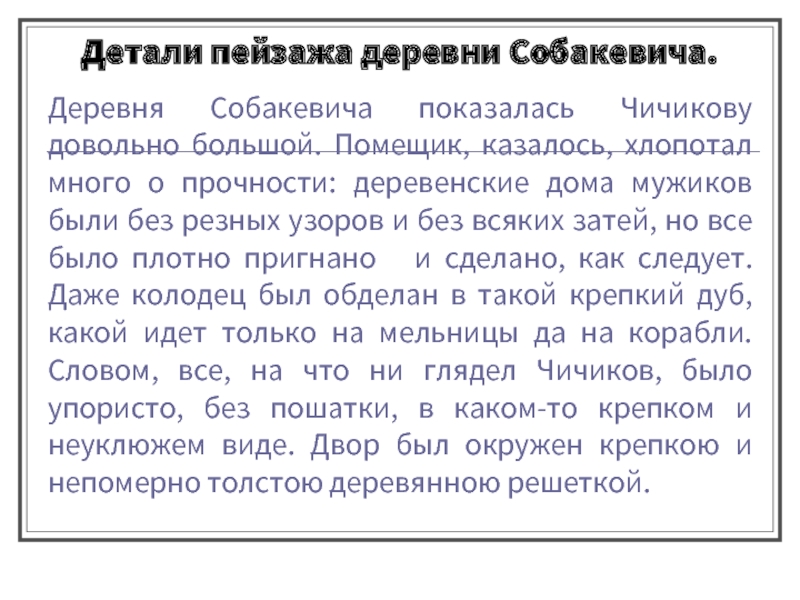 хлопотал много о прочности: деревенские дома мужиков были без резных узоров и без всяких затей, но все было плотно пригнано и сделано, как следует. Даже колодец был обделан в такой крепкий дуб, какой идет только на мельницы да на корабли. Словом, все, на что ни глядел Чичиков, было упористо, без пошатки, в каком-то крепком и неуклюжем виде. Двор был окружен крепкою и непомерно толстою деревянною решеткой.