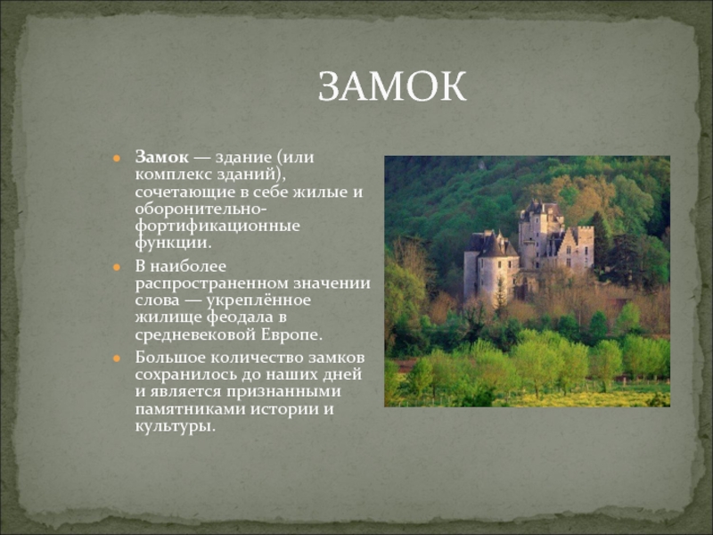 В наиболее распространенном значении слова — укреплённое жилище феодала в средневековой Европе.
